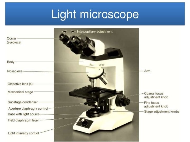 v Revolve the nose piece to set low-power objective lens. v Adjust the Condenser lenses and diaphragm. v Place a slide on the stage and secure with stage clips. v Switch on the light at low intensity and then increase intensity. v Turn the coarse adjustment knob to lower the body tube until the low power objective reaches its lowest point. v Looking through the eyepiece, very slowly move the coarse adjustment knob until the specimen comes into focus. v Adjust distance between eye piece.