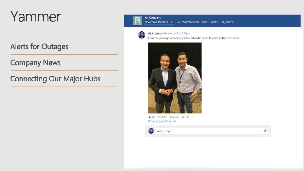 Using Flow to extend the experience for our employees… Automatically posting to the integrated feed on a site whenever: • A document is posted • A new list item has been added • Feedback is given on one of our projects Goal: To turn our Yammer feeds into activity feeds for each site