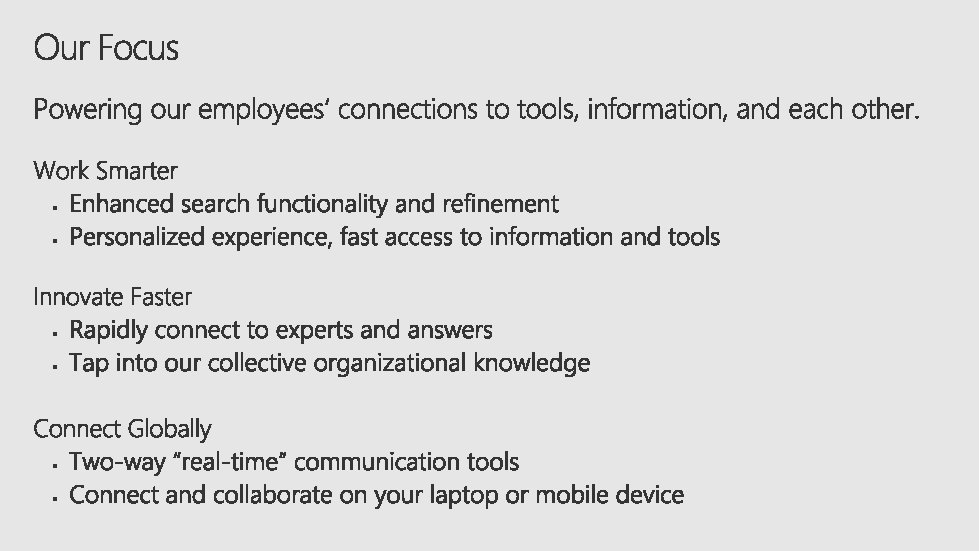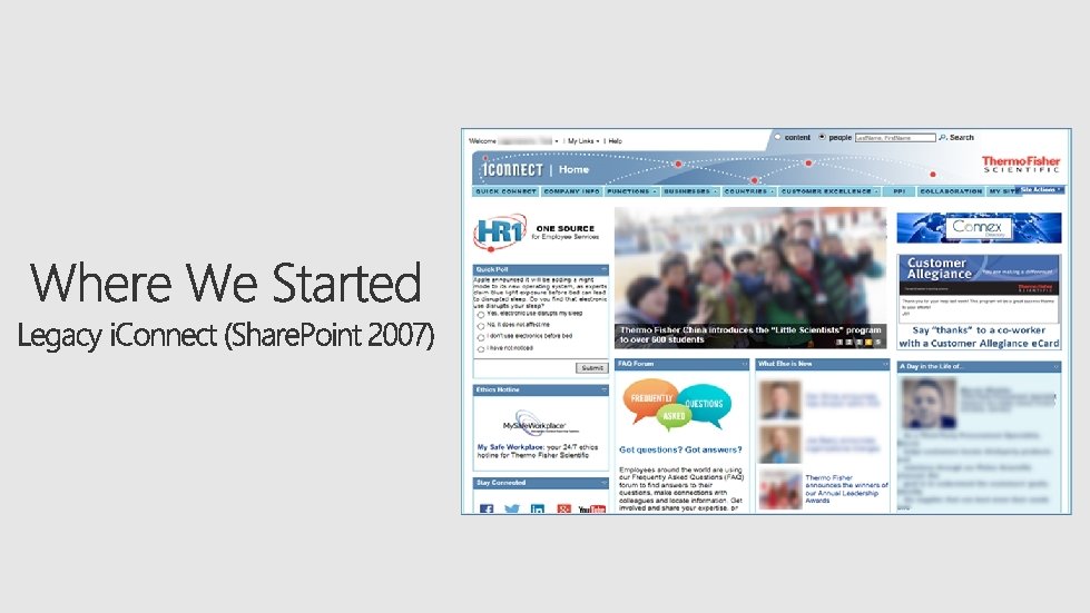 • 90, 000+ Employees Worldwide • Share. Point 2010 Enterprise Farm 8 TB of content Over 50 Full Trust Solutions Over 300 Sandbox Solutions • Share. Point 2013 Project Server Farm