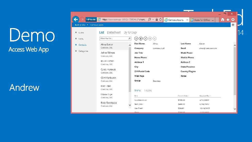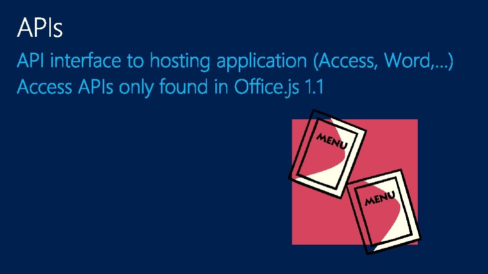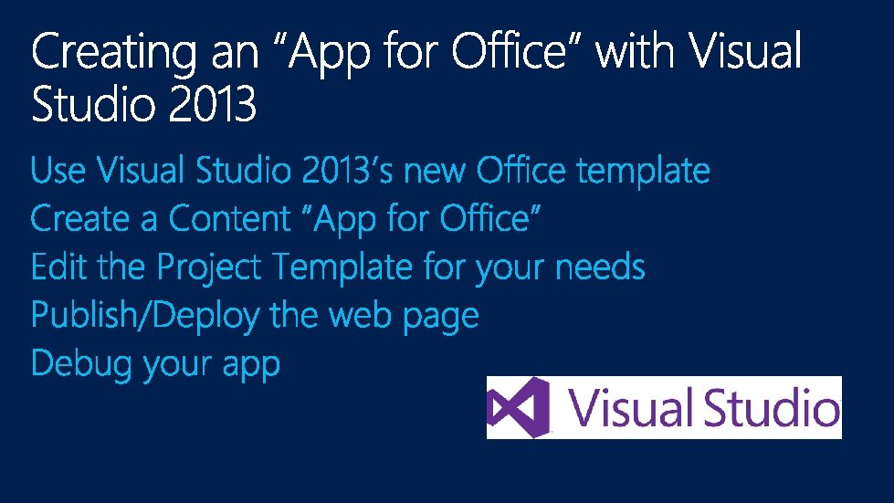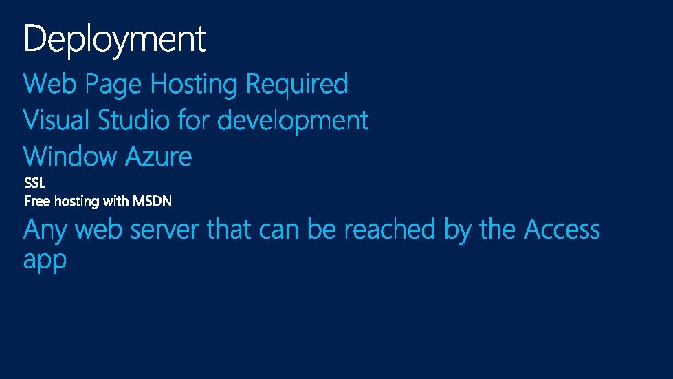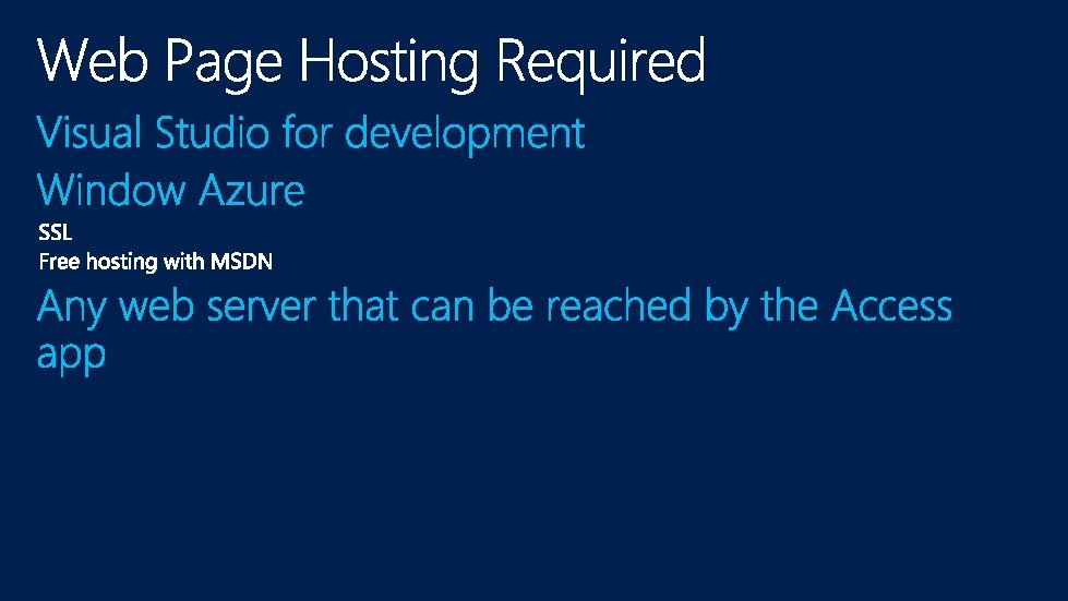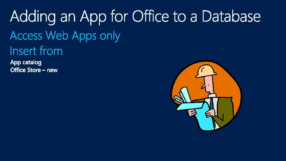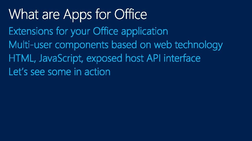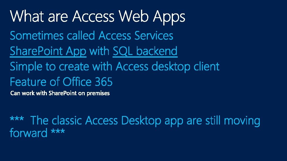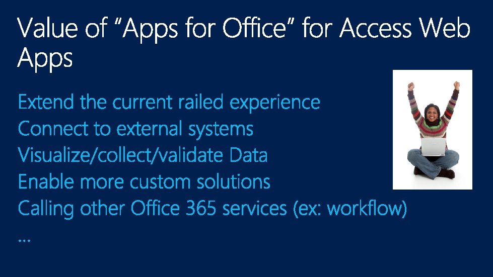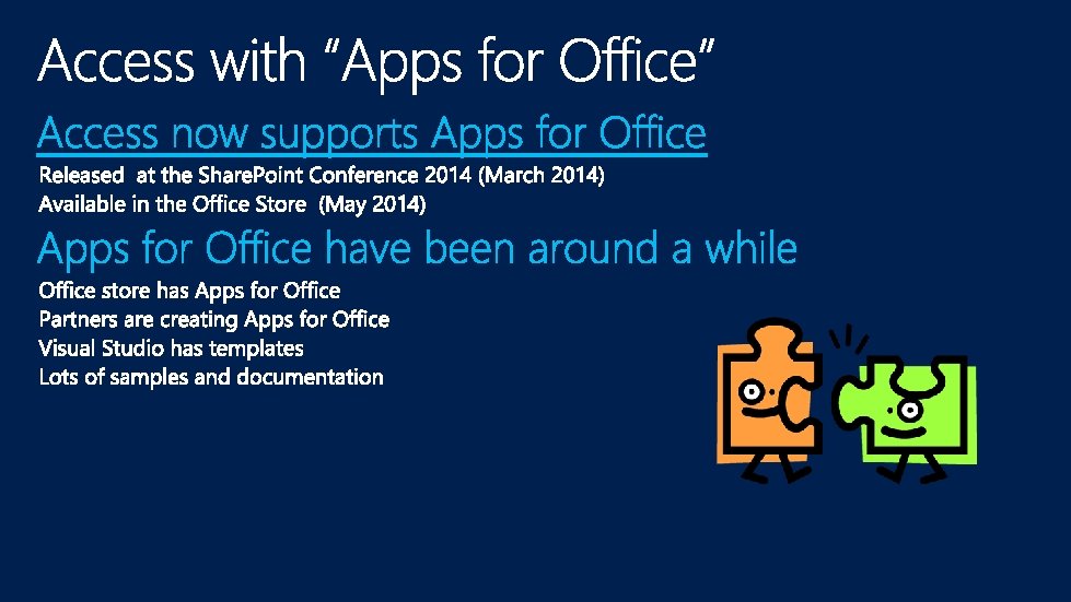 Microsoft Access • What are Access Web Apps for Office • What are “Apps for Office” • Access “Apps for Office” • Value of “Apps for Office” Technical Details • How it all works • Creating an “App for Office” with Visual Studio 2013 • APIs, Publishing, Resources