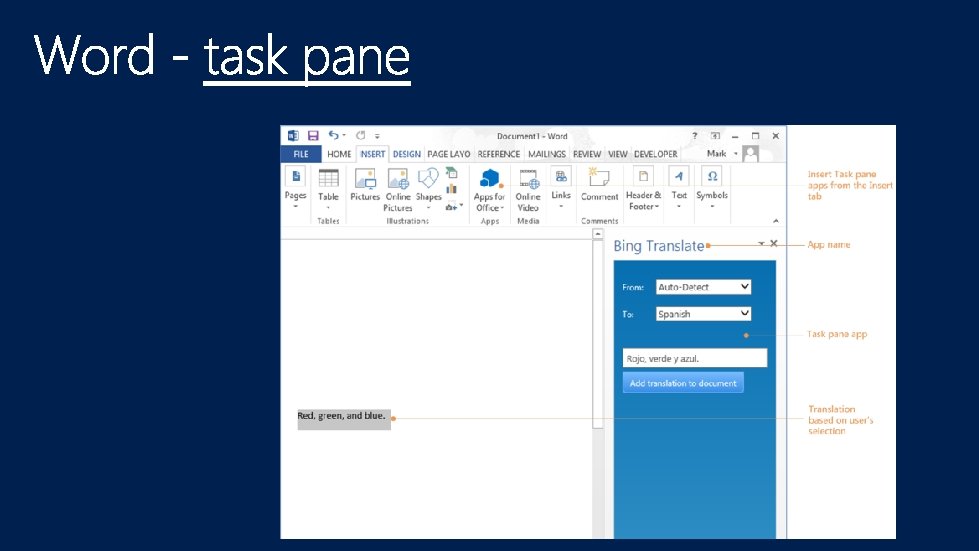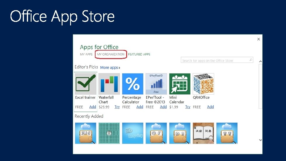 Supported app types Application Supported types Excel 2013 • Task pane • Content Excel Web App • Content Word 2013 • Task pane Outlook 2013 • Mail Outlook Web App • Mail Project Professional 2013 • Task pane