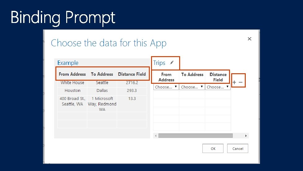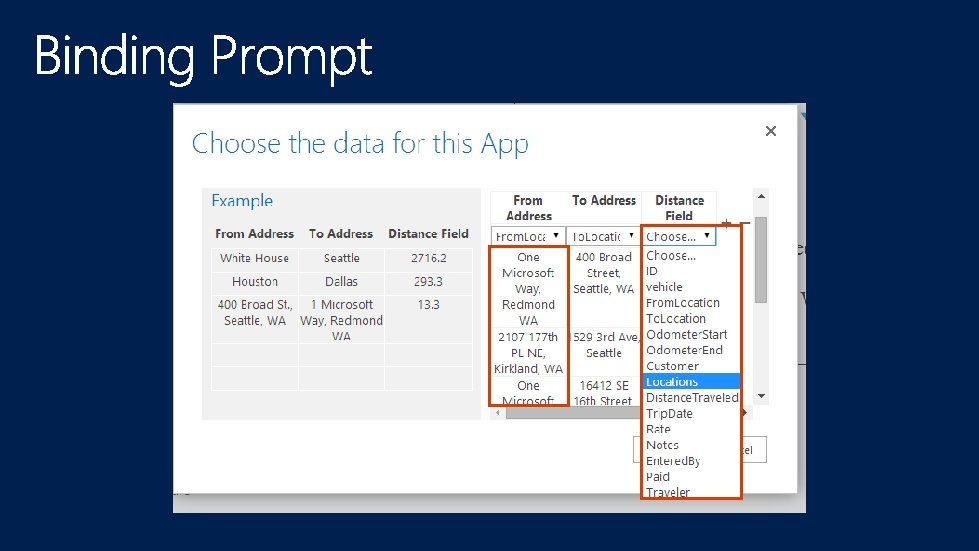var sample. Data. Table = new Office. Table. Data(); sample. Data. Table. headers = [["From Address", "To Address", "Distance Field"]]; sample. Data. Table. rows = [ ["White House", "Seattle", "2716. 2"], ["Houston", "Dallas", "293. 3"], ["400 Broad St. , Seattle, WA", "1 Microsoft Way, Redmond WA", "13. 3"]]; Office. context. document. bindings. add. From. Prompt. Async(Office. Binding. Type. Table, { id: Binding. Name, sample. Data: sample. Data. Table }, Binding. Handler); function Binding. Handler(binding. Callback) { if (binding. Callback. status == Office. Async. Result. Status. Succeeded) { //Binding has been created successfully } }