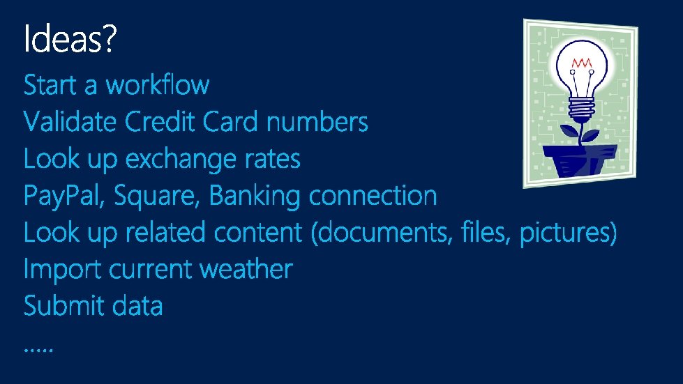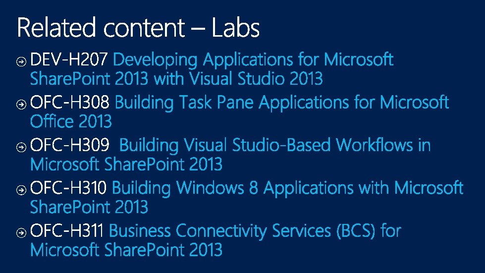 DEV-B 232 Creating Cloud Hosted Line-of-Business Applications with Apps for Office, Microsoft Office 365, Microsoft Azure, and Windows Phone 8 OFC-B 311 A Practical Use of External Data Sources DEV-B 357 Developing Office 365 Cloud Business Applications DEV-B 387 Deep Dive into Mail Compose Applications APIs DEV-B 386 Setting Up Your On-Premises Environment for App Development DEV-B 228 Build Connected Productivity Apps for Share. Point and Office DEV-B 390 Share. Point Power Hour: New Developer APIs and Features for Apps for Share. Point DEV-B 389 Who Are You and What Do You Want? Working with OAuth in Microsoft Share. Point 2013