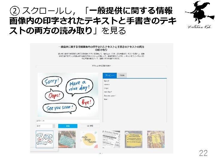 Microsoft Azure Computer Vision に サインインし,「デモ」をみてみる ① Web ブラウザで,Microsoft Azure Computer Vision の Web ページを開く https: //azure. microsoft. com/ja-jp/services/cognitive -services/computer-vision/ 21