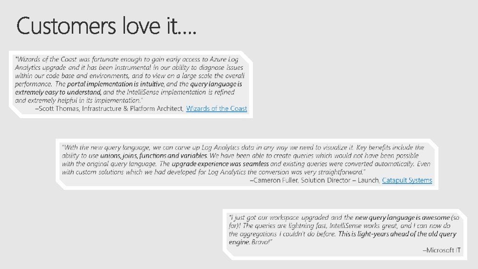 FAQs and Known Issues • My dashboard will be read only • View Designer and Azure Dashboards. Existing tiles become read-only. • Search API will be deprecated by Dec 31 2017 • Use the new Azure log analytics API. • Power. BI integration now replaced with Power. BI Desktop Integration • Any existing schedules will be disabled. • Alert actions using web hooks and runbooks will need to be updated • Need to conform to a different response format. For more details, see the known issues and FAQs page