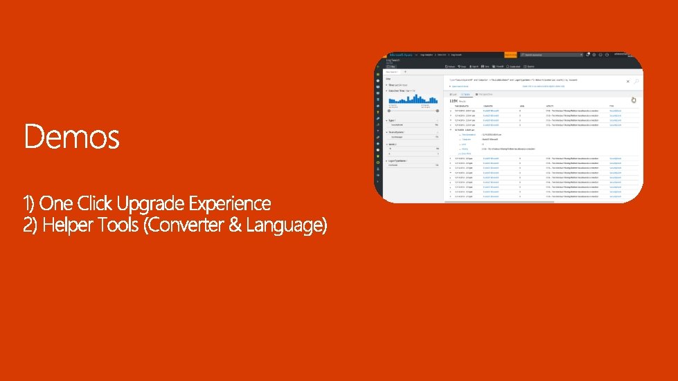 Generally Available (Automatic Upgrades) Public Preview (Optional Upgrade) Private Preview (Invitation Only) • 200+ workspaces • Some of the largest OMS customers including MSIT • Available in 3 regions • All supported OMS public regions • Top Solutions migrated • Documentation / Community site • 50% of workspaces upgraded • All Solutions migrated • Automatic upgrades of all remaining workspaces