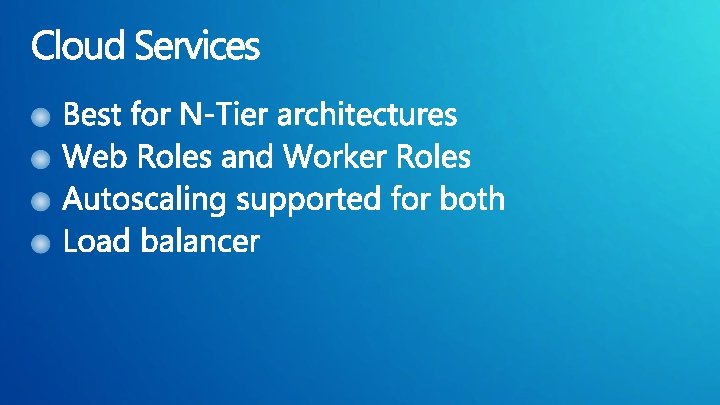 Internet L B Scalable Roles Microsoft Azure Queues Web Site Web Role (ASPX, ASMX, WCF) Worker Service (ASPX, ASMX, (ASPX, WCF) Tables Storage Blobs