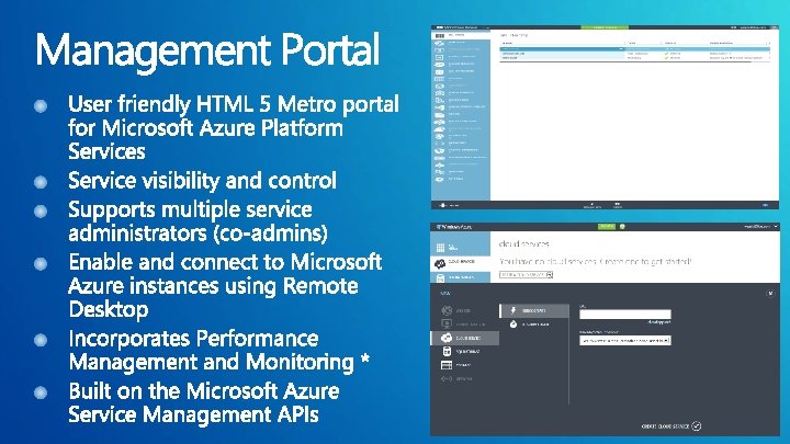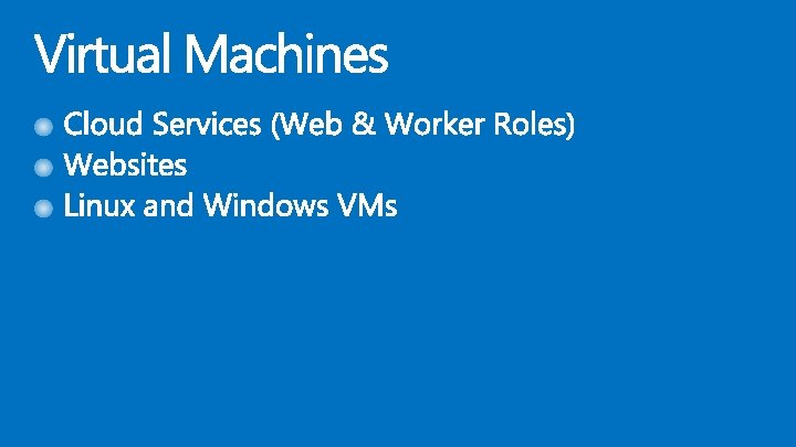 Traffic Manager Routes request to “nearest” service endpoint (Azure or Non-Azure) Useful for performance, business continuity, price, compliance & tax Not the same as CDN CNAMEs supported 1. 2. 3. 4 foo. cloudapp. net DNS response Traffic Manager Policies Monitoring foo-us. cloudapp. net foo-europe. cloudapp. net foo-asia. cloudapp. net Cloud Services and Websites in same or different data centers