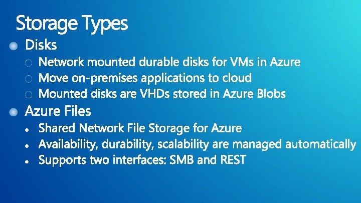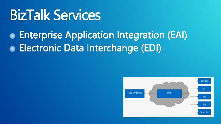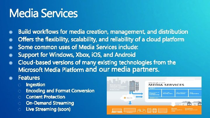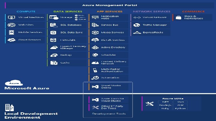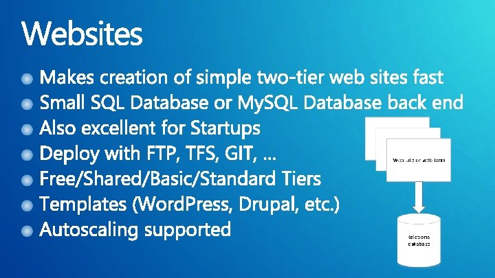 • • Backend solutions to power mobile apps i. OS, Android, Windows Phone & Windows 8 Structured storage User Authentication: • • • Microsoft Account, Twitter, Facebook, Google Push notifications (massive) Scheduling Logging & diagnostics Offline Sync