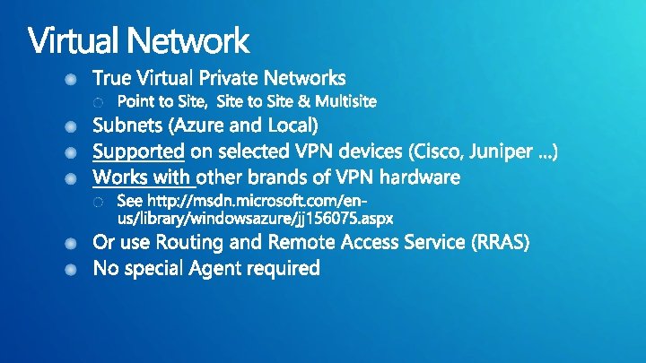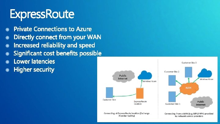 Cloud Customer What’s new Secure point-to-site connectivity Virtual Network (Point-to-Site) Secure site-to-site VPN connectivity Biz. Talk Services Hybrid Connection Express Route Private siteto-site connectivity • Site to Site and Multi-Site • Connect Azure and On. Premises resources (Databases, etc. ) • AT&T, Equinix, Level 3