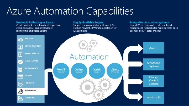 • • • Management • REST API • . NET Client • Power. Shell • Portal Experience Actions • HTTP & Storage Queue Actions • Error Handler • Configurable Retry Scheduling • Fire once • Simple recurrence • Complex schedule Monitoring Execution History