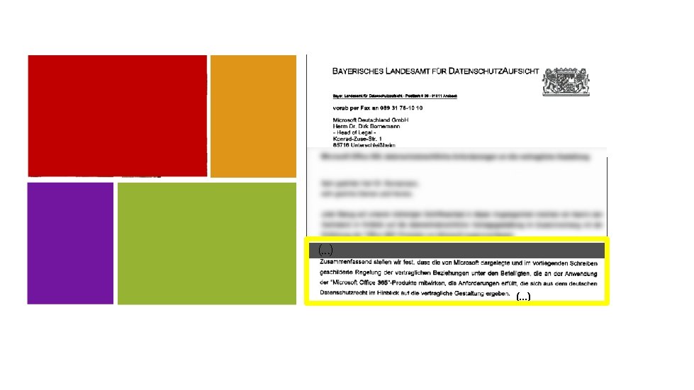 Wir erfüllen die datenschutzrechtlichen Anforderungen! Maßnahme Microsoft Forderung ADV-Vertrag mit EUAuftragnehmer • Dataprocessing Agreeement (DPA) Offenlegung von Subunternehmern (inkl. • • Model Clauses (Ziffer 5 j, 11. 4) Trust Center Technische und organisatorische Maßnahmen (TOM) • • Dataprocessing Agreeement (Ziffer 5 a) In Model Clauses (Appendix 2) • • Model Clauses Zertifizierung nach ISO 27001 plus TOM nach § 9 BDSG (DPA Ziffer 5 b) • • Dataprocessing Agreement (Ziffer 5 a) In Model Clauses (Appendix 2) • Ergänzende Regelungen zu Model Clauses mit MSFT Corp (Appendix 1 und 2) Relevanter Vertragsinhalte) Kontrolle durch AG Vorort-Kontrollen oder Zertifizierungs-/Gütesiegelverfahren einer unabhängigen Prüfstelle Drittstaatentransfer: angemessene Garantien, z. B. Model Clauses Drittstaatentransfer: zusätzlich ADV-Vertrag Ergebnis