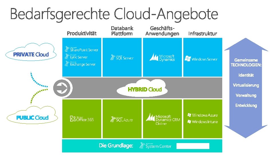 Client Software vor Ort Server vor Ort l Unternehmenskritische Anwendungen l Regularien und gesetzliche Vorgaben (z. B. SGB) l Vertrauen, Kontrolle (Besitz von Daten)) l Offline-Szenarien l Eigene Hard- und Software (flexible Konfiguration, aber Admin-Kosten) l Vorab-Kosten für eigene Infrastruktur Server bei Dienstleister / CC* l Einfluss auf Serverkonfiguration möglich l Individuelle Anforderungen möglich l Kurze Time-to-Market l Vereinbarung von Service Leveln * Community Cloud Software in der Cloud (Globaler Anbieter) l Massive Skalierbarkeit l Self-Service Verwaltung l Automatisiertes Anwendungsmanagement l Kürzeste Time-to-Market l Nutzungsabhängige Abrechnung l Feste Service Level (i. d. R. 99, 9%)