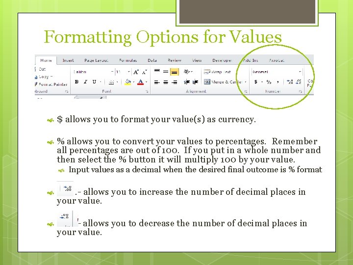 Formatting Options for Values $ allows you to format your value(s) as currency. % allows you to convert your values to percentages. Remember all percentages are out of 100. If you put in a whole number and then select the % button it will multiply 100 by your value. Input values as a decimal when the desired final outcome is % format . - allows you to increase the number of decimal places in your value. - allows you to decrease the number of decimal places in your value.