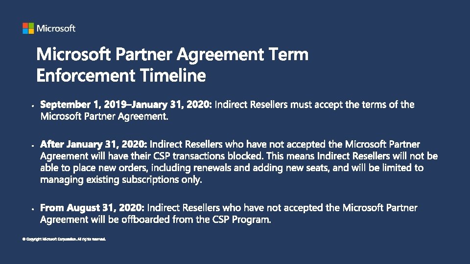 • All partners in the CSP program including CSP Resellers are required to accept the Microsoft Partner Agreement • Indirect Resellers participating in the CSP program need to work with Indirect Providers to onboard on Partner Center and to execute relevant terms • Partner Center Dashboard will be the main method of communication for all partner types including Indirect Resellers