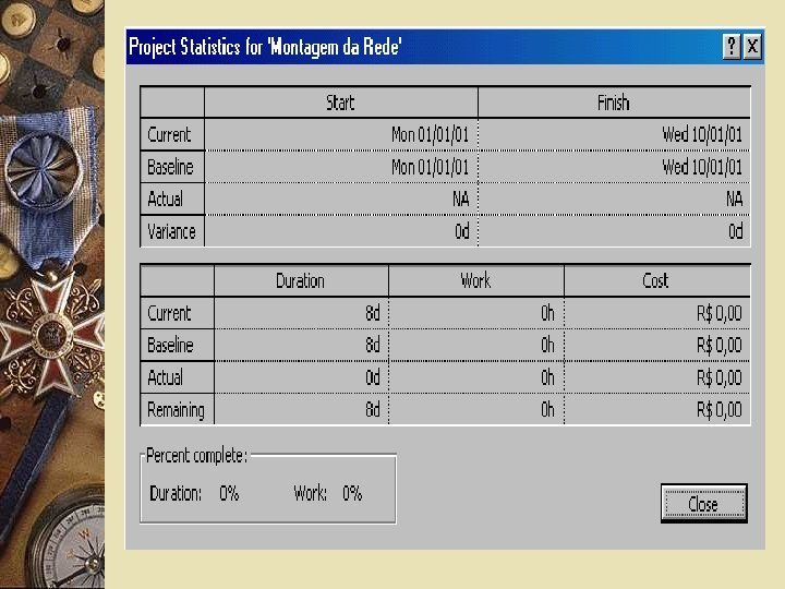 Custos Os custos são ligados diretamente às tarefas na forma de custos fixos ou de custos dos recursos alocados.