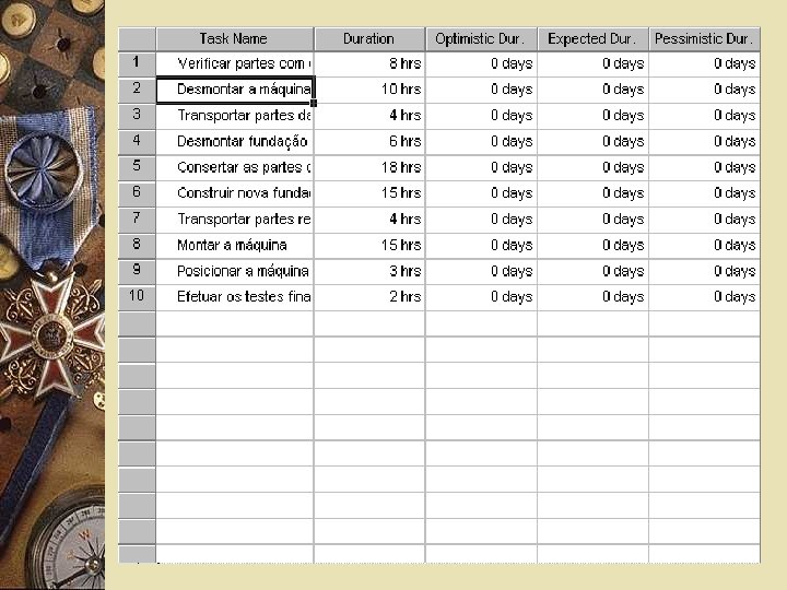 Modelo Probabilístico O MS Project permite a entrada de dados no chamado “modelo probabilístico”. Nesta opção, você informa a duração otimista, a esperada e a pessimista para cada tarefa.