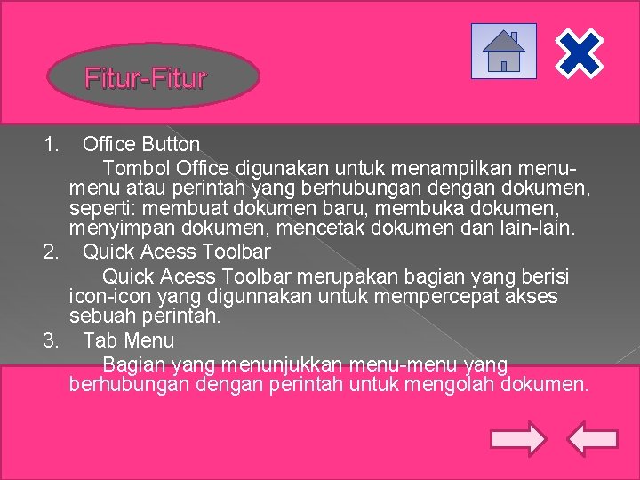 Fitur-Fitur 1. Office Button Tombol Office digunakan untuk menampilkan menu atau perintah yang berhubungan dengan dokumen, seperti: membuat dokumen baru, membuka dokumen, menyimpan dokumen, mencetak dokumen dan lain-lain. 2. Quick Acess Toolbar merupakan bagian yang berisi icon-icon yang digunnakan untuk mempercepat akses sebuah perintah. 3. Tab Menu Bagian yang menunjukkan menu-menu yang berhubungan dengan perintah untuk mengolah dokumen.