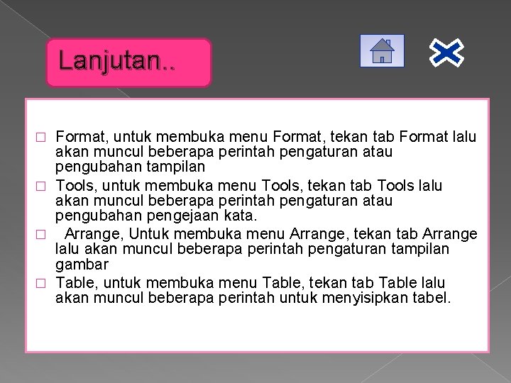 Lanjutan. . Format, untuk membuka menu Format, tekan tab Format lalu akan muncul beberapa perintah pengaturan atau pengubahan tampilan � Tools, untuk membuka menu Tools, tekan tab Tools lalu akan muncul beberapa perintah pengaturan atau pengubahan pengejaan kata. � Arrange, Untuk membuka menu Arrange, tekan tab Arrange lalu akan muncul beberapa perintah pengaturan tampilan gambar � Table, untuk membuka menu Table, tekan tab Table lalu akan muncul beberapa perintah untuk menyisipkan tabel. �