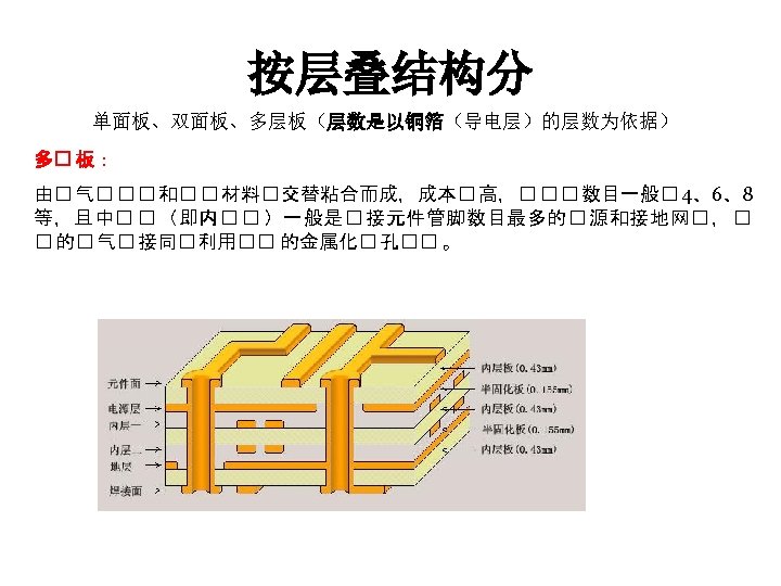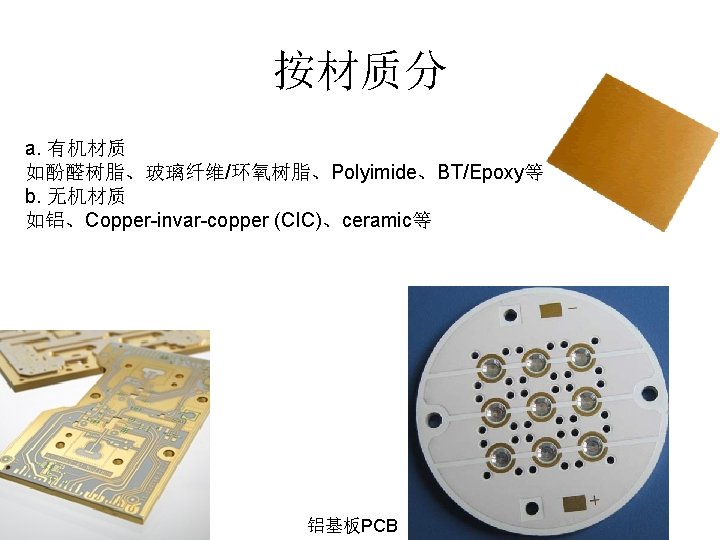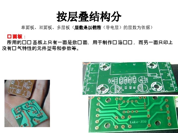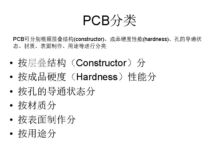按表面制作分:(solder. Surface) Hot Air Level Soldering �� (HASL) Entek/OSP(防氧化)板 Carbon Oil 碳油板 Peelable Mask � 胶板 Gold Finger 金手指板 Immersion Gold 沉金板 Gold Plating � 金 Immersion Tin 沉� 板 Immersion Silver 沉� 板(D 2厂) 按用途分: 通信/耗用性� 子/� 用/� 算机/半� 体/�� 板…, BGA等