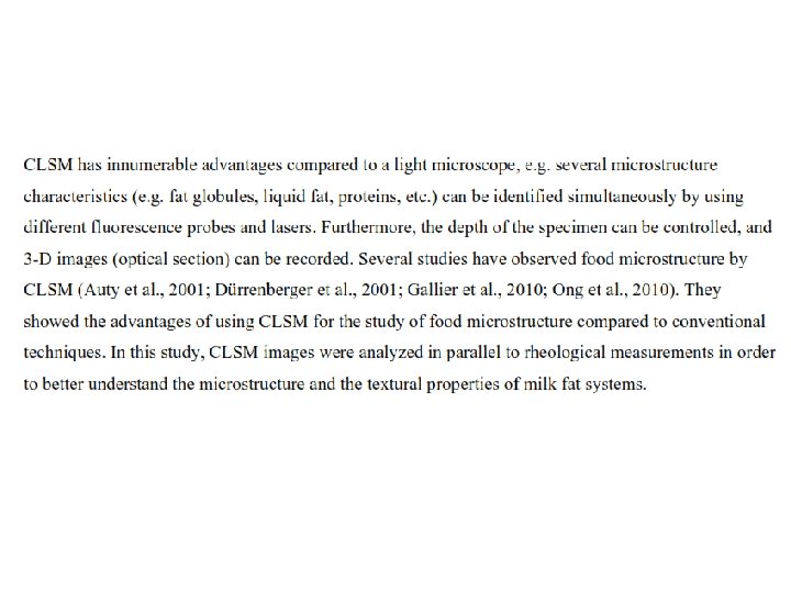 microscopic techniques are used to observed food microstructure • • light microscope, polarized light microscope (PLM), scansion or transmission electron microscope (SEM and TEM) and confocal laser scanning microscopy (CLSM). • CLSM is one of the most accurate instruments for observing complex food microstructure. The CLSM uses a scanning laser, or a combination of several scanning lasers, to illuminate the specimen. The light emitted by the laser (excitation source) pass through a pinhole (confocal aperture) and is reflected by a dichromatic mirror and then scanned across the specimen in a focal plane. From the same focal plane, fluorescence light is emitted from the