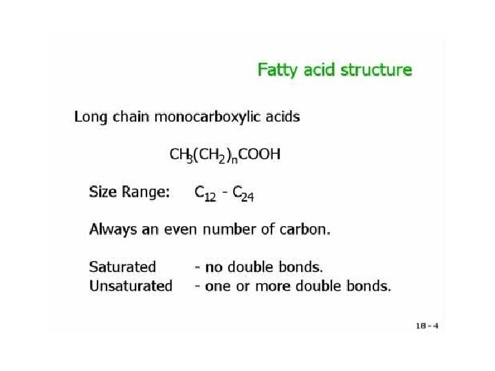 FATS • At room temperature, the fats rich in saturated fats (butter, lard, coconut oil, ) are solid (hard). • Polyunsaturated fatty acids (vegetable oils) are liquid.