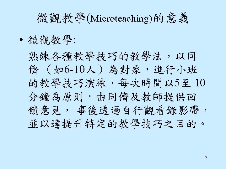 Microteaching 的助益-2 • Organization – introduction / objectives – use of examples & illustrations – planned repetition / signaling of main points – logical presentation of information – use of teaching aids & equipment – closure (U of Toronto, Teaching assistants’ training program /http: //www. utoronto. ca/tatp/whoweare. html/2006年 8月2日引用) 12