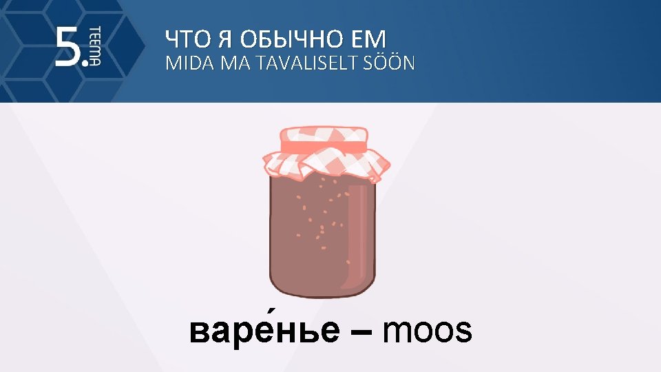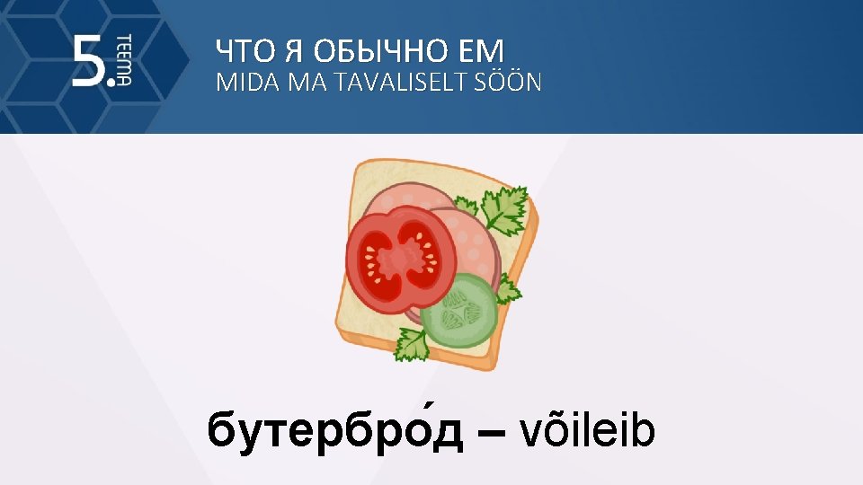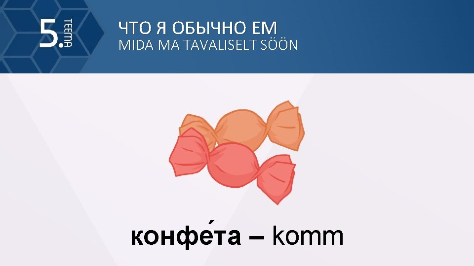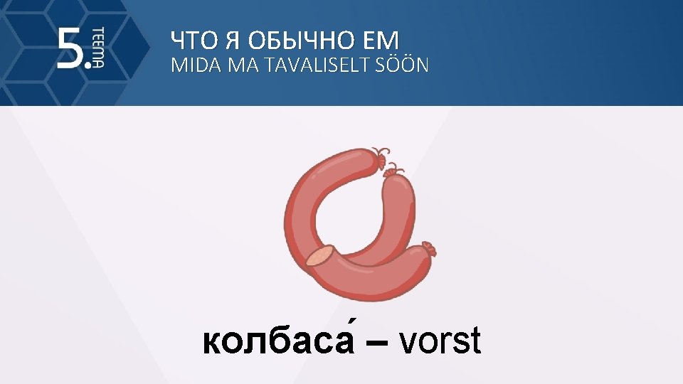 MIDA MA TAVALISELT SN MIDA MA TAVALISELT SN Slides: 37 Download presentation ЧТО Я ОБЫЧНО ЕМ MIDA MA TAVALISELT SÖÖN ЧТО Я ОБЫЧНО ЕМ MIDA MA TAVALISELT SÖÖN мя со (ainult ainsus) – liha ЧТО Я ОБЫЧНО ЕМ MIDA MA TAVALISELT SÖÖN мёд (ainult ainsus) – mesi ЧТО Я ОБЫЧНО ЕМ MIDA MA TAVALISELT SÖÖN шокола д (ainult ainsus) – šokolaad ЧТО Я ОБЫЧНО ЕМ MIDA MA TAVALISELT SÖÖN чай (ainult ainsus) – tee ЧТО Я ОБЫЧНО ЕМ MIDA MA TAVALISELT SÖÖN вода (ainult ainsus) – vesi ЧТО Я ОБЫЧНО ЕМ MIDA MA TAVALISELT SÖÖN молоко (ainult ainsus) – piim ЧТО Я ОБЫЧНО ЕМ MIDA MA TAVALISELT SÖÖN суп – supp ЧТО Я ОБЫЧНО ЕМ MIDA MA TAVALISELT SÖÖN рис (ainult ainsus) – riis ЧТО Я ОБЫЧНО ЕМ MIDA MA TAVALISELT SÖÖN хлеб (ainult ainsus) – leib ЧТО Я ОБЫЧНО ЕМ MIDA MA TAVALISELT SÖÖN сыр – juust ЧТО Я ОБЫЧНО ЕМ MIDA MA TAVALISELT SÖÖN пиро г – pirukas ЧТО Я ОБЫЧНО ЕМ MIDA MA TAVALISELT SÖÖN тво ро г (ainult ainsus) – kohupiim ЧТО Я ОБЫЧНО ЕМ MIDA MA TAVALISELT SÖÖN смета на (ainult ainsus) – hapukoor ЧТО Я ОБЫЧНО ЕМ MIDA MA TAVALISELT SÖÖN горчи ца (ainult ainsus) – sinep ЧТО Я ОБЫЧНО ЕМ MIDA MA TAVALISELT SÖÖN хрен – mädarõigas ЧТО Я ОБЫЧНО ЕМ MIDA MA TAVALISELT SÖÖN майоне з – majonees ЧТО Я ОБЫЧНО ЕМ MIDA MA TAVALISELT SÖÖN ма сло (ainult ainsus) – või ЧТО Я ОБЫЧНО ЕМ MIDA MA TAVALISELT SÖÖN пюре (ainult ainsus) – püree ЧТО Я ОБЫЧНО ЕМ MIDA MA TAVALISELT SÖÖN пече нье (ainult ainsus) – küpsis ЧТО Я ОБЫЧНО ЕМ MIDA MA TAVALISELT SÖÖN ко фе (ain. ainsus) – kohv ЧТО Я ОБЫЧНО ЕМ MIDA MA TAVALISELT SÖÖN сок – mahl ЧТО Я ОБЫЧНО ЕМ MIDA MA TAVALISELT SÖÖN са хар (ain. ainsus) – suhkur
