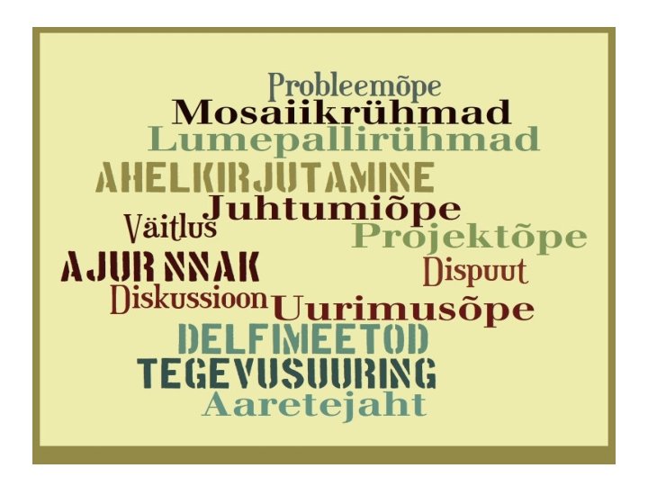 Takistused • • • õppekava mahukusest tingitud ajapuudus; liiga suured õpilasgrupid; kesised tingimused õppimiseks ja vajalike materjalide puudus; teiste õpetajate küüniline suhtumine uuendustesse; õpilaste nõrgad õpioskused; lapsevanemate traditsioonilised ootused (mure uute õppemeetodite kasutamise osas). aktiivõppemeetoditel põhinevad ülesanded võivad kujuneda ajaliselt väga mahukaks, ei pruugita nende kasutamise tõttu jõuda täita kõiki õppekavas ettenähtud eesmärke; nõuab õpetajalt väga pikka ettevalmistust; kui õpilaste arv klassis suur, siis on õpetajal üksi raske kõiki õpilasi suunata ja toetada; on oht, et õppijad võivad ise liialt passiivseks osutuda õpilased võivad olla rühmades töötamise suhtes vastumeelsed, mille põhjuseks võib olla: – nõrgad õpioskused – piinlikkustunne klassikaaslaste ja õpetaja ees Õpetaja roll on väga oluline, kuna oskusliku juhendamise ja toetuseta tõttu võib aktiivõppemeetodite kasutamisega kaasneda koguni negatiivne mõju õpilaste tulemustele (Prince, 2004).