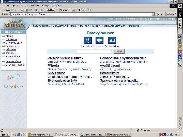 Přelomový rok 2001 • pokračuje naplňování systému metadaty o DS centrálních orgánů • příprava a realizace nové verze systému – profesionalizace uživatelského rozhraní – úpravy struktury dle nově přijatého Standardu ISVS pro strukturu a výměnný formát metadat informačních zdrojů – nové editační rozhraní • červen-listopad 2001 – evidence geodat na OkÚ (koordinátor MV) • září 2001 – smlouva CAGI+ÚVIS – analýza metadat OkÚ – závěry a doporučení pro OPS-krajů – vytvoření MIDASLite – lokální meta. IS (plnička) pro pořizování, správu metadat a jejich přenos do centrálního skladu MIDAS • 6. září 2001 – začlenění MIDAS do Národní geoinformační infrastruktury ČR
