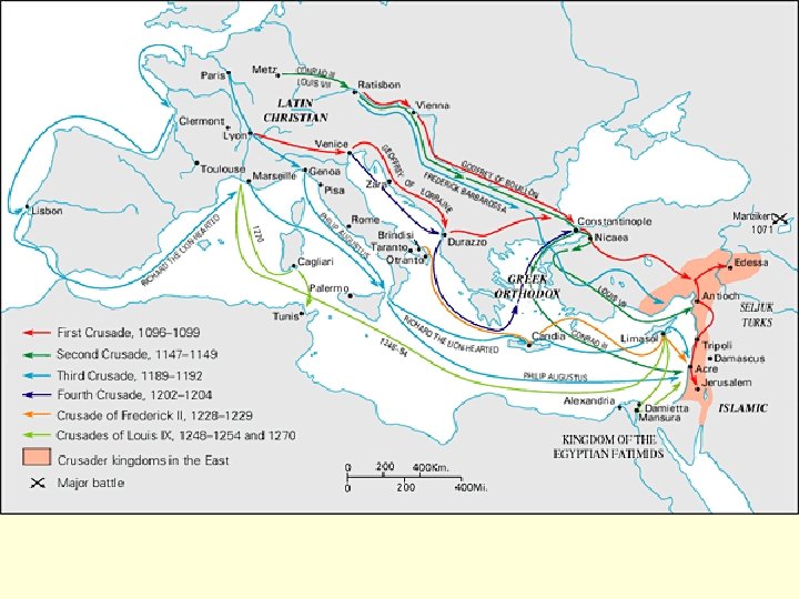 IV. The Crusades A. Background to the Crusades 1. Islam and the Seljuk Turks; 600 CE Muslims occupy Holy Land; 1070 Attack Byzantine Empire; Byzantine Church asks Pope Urban II for help 2. The Byzantine Empire—loses Anatolia to the Turks; Turks disrupt Pilgrim traffic 3. Causes: Europe begins to thrive Conversion of Vikings and Magyars Agricultural advances increase food supply Roman-Byzantine rivalry Great Schism, 1064 Benedictine reform causes Church in West to be more attentive to business and provides impetus to attempts to reassert control