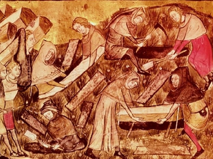 B. The Black Death • In 1347, the Black Death struck Europe. Those bitten by infected fleas died horrible deaths within a week's time. Those who inhaled the virus died even sooner. • The plague decimated the populations of the densely populated cities of Northern Italy. The population of Florence, for instance, fell from 90, 000 to 50, 000 people. Within a generation, the plague wiped out 40 percent of the English population and nearly 60 percent of the population in northeastern France. • First major epidemic disease to hit Europe since the 7 th c. 1. Spread of the Plague-flea infested rats brought by the Mongols to the Black Sea and then through trade markets through Genoese merchants in Italy. 25 -50% of the European population declined between 1347 and 1351. 2. Life and Death: Reactions to the Plague • Live for the moment; wealthy fled to country estates, extreme behavior (flagellants and millenarians), anti-Semitism, preoccupation with death C. Economic Dislocation and Social Upheaval 1. Noble Landlords and Peasants-Fewer workers meant higher wages and lower prices; resented by the aristocracy; freed peasants from servitude and manorialism weakened. Lords attempted to institute wage restrictions and new obligations; new governmental taxes. 2. Peasant Revolt in France-Jacquerie-class tensions; 100 Years’ Wardestroyed land stolen produce; massacres both sides 3. An English Peasant Revolt-over poll tax 4. Revolts in the Cities-manufacturers, industrial revolts