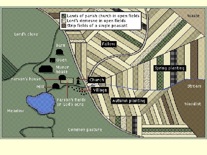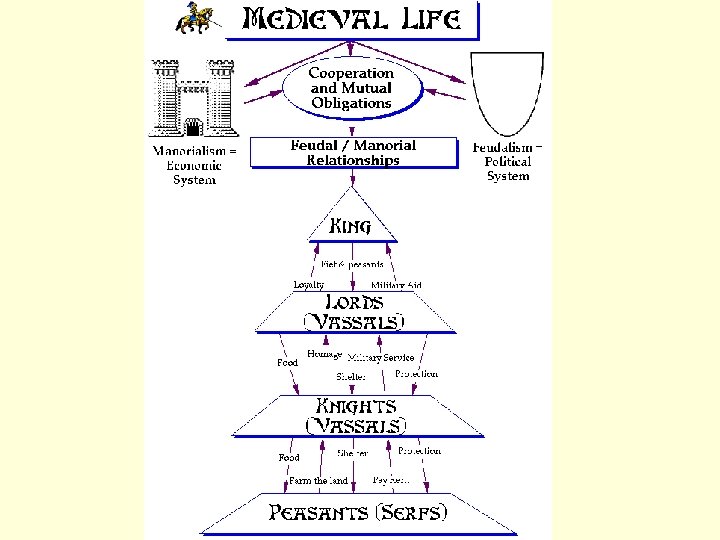 III. The Emerging World of Lords and Vassals (9 th-10 th c. )—renewed invasions and disintegration of Carolingian empire. Protection needed. A. Vassalage-individual who serves a lord in a military capacity. Came from German society. Vassal granted land in return for fighting. B. Fief-holding: land subinfeudation 1. Mutual Obligations; advice, service, hospitality, and aids in return for fiefs and support C. New Political Configurations in the Tenth Century—new powerful lords 1. The Eastern Franks-Henry the Fowler (Saxons); son Otto I-greatest. Defeated Magyars at the Battle of Lechfeld, encouraged Christianization, crowned emperor of the Romans—involved in Italian affairs, relied on bishops and abbots in governing kingdom (no hereditary worries). 2. The Western Franks-Hugh Capet, count of Orleans and Paris; only controlled land surrounding Paris (Ile-de-France); actually a loose alliance of powerful lords and not a unified kingdom under the king. However, Capetian dynasty would last for centuries. 3. Anglo-Saxon England-Alfred the Great, king of Wessex, defeated and created peace with the Danes. Strengthened army and navy, encouraged the translation of works from Latin into Old English (vernacular), and successors would establish a unified Anglo-Saxon monarchy. D. The Manorial System-agricultural estate operated by a lord and worked by peasants. Many became bound to the land as serfs. By 9 th c. -60% of population were serfs. 90% people worked the land.