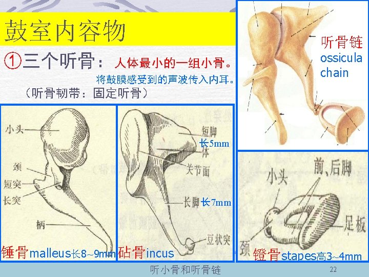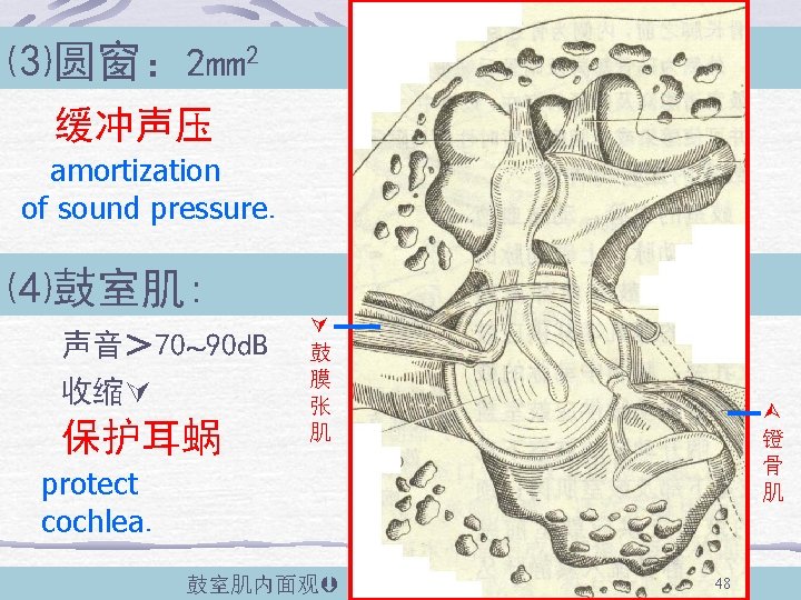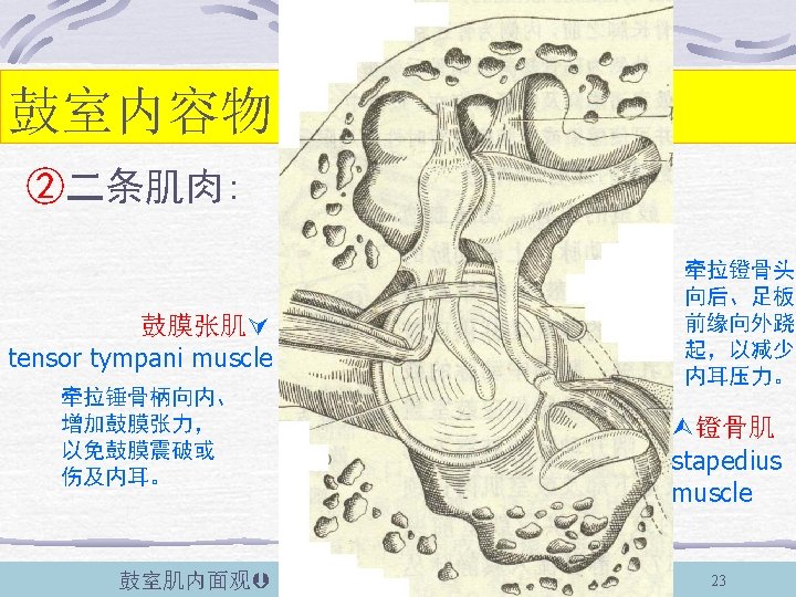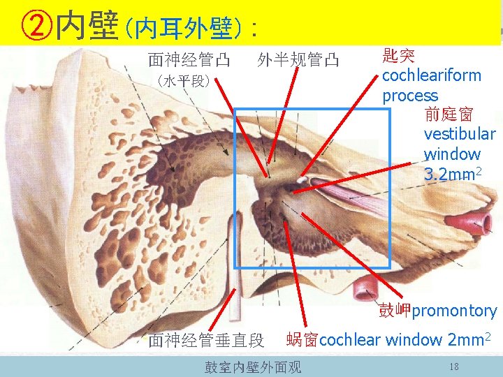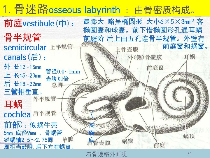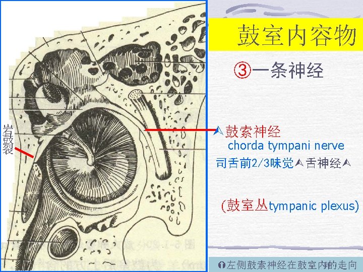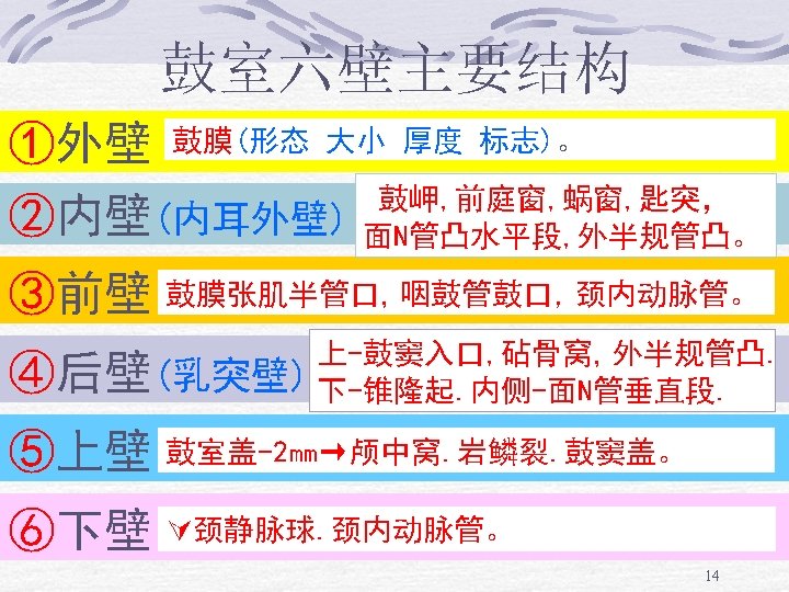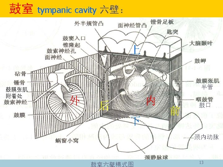 1. 鼓室: Tympanic cavity 上下径15 mm 前后径13 mm 容 积 1~ 2 ml 分三部: 上鼓室 epitympanum 内外径6 mm. 中鼓室 mesotympanum 内外径2 mm. 下鼓室 hypotympanum 内外径4 mm. 鼓室冠状剖面图 12