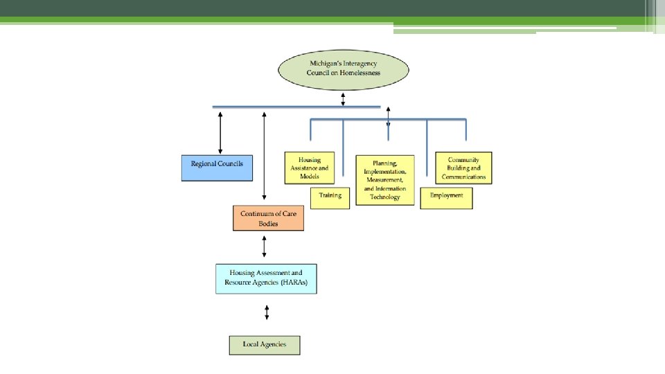 Michigan Housing Assessment and Resource Agency (HARA) “With Continuum of Care (Co. C) oversight, the HARA operates a centralized intake system by mapping out the resources and delivery process used to prevent homelessness and rapidly re-house people living in homelessness. As a result, duplication of services is reduced and gaps within the community’s system are identified. In addition, the HARA’s centralized intake system overcomes barriers that individual programs cannot address, allowing communication, coordination, and collaboration to be brought to scale on a community-wide level. Moreover, the HARA’s centralized intake system challenges Co. C communities to do business differently, direct resources in new, innovative ways, and allows for investment in a Co. C’s infrastructure. ” - Emergency Solutions Grant NOFA