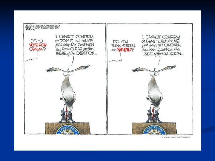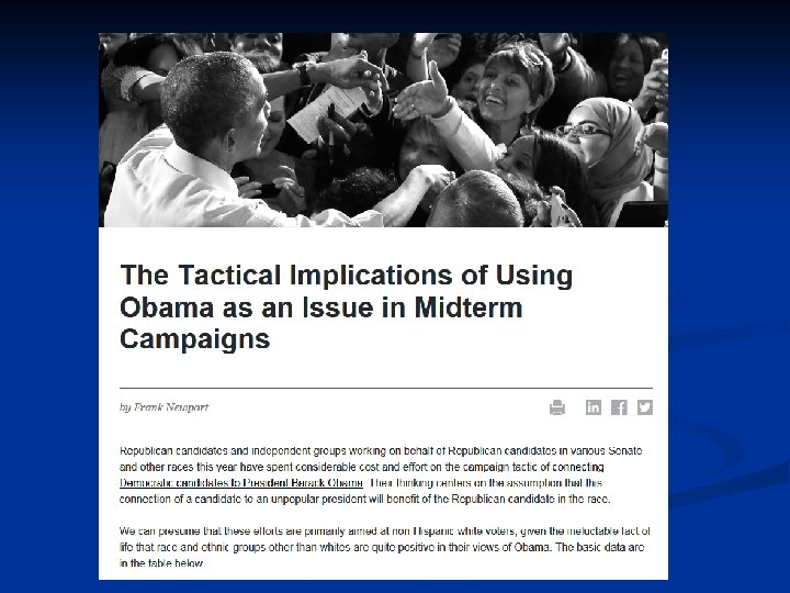 Fair’s Model VOTECC = 48. 53 -. 482*INFLATIONCC +. 710*(15/7)*GOODNEWSCC VOTECC = Democratic share of the two-party House vote in 2014. INFLATIONCC = The growth rate of the GDP deflator in the first 7 quarters of the second Obama administration, 2013: 1 -2014: 3, at an annual rate. GOODNEWSCC = The number of quarters in the first 7 quarters of the Obama administration in which the growth rate of real per capita GDP is greater than 3. 2 percent at an annual rate. These values lead to a predicted Democratic vote share of 50. 85 percent