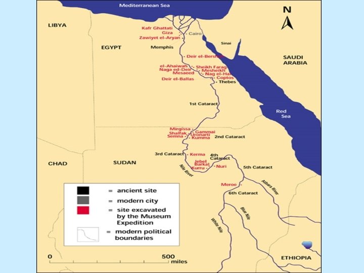 Ancient Egypt • Centered along the Nile River and its tributaries • Nile River is 4, 000 miles long flowing from Khartoum to the Mediterranean • Flood cycle of the Nile helped shape ancient Egyptian life • Protected by location • Originally divided into two kingdoms – Upper Egypt – river valley – Lower Egypt – river delta