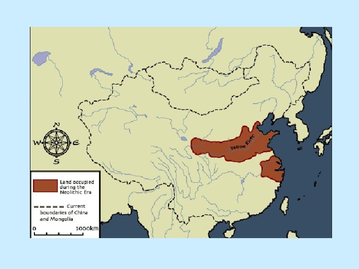 Neolithic “China” • “Chinese” civilization developed around two main rivers: the Yellow (Huang He) and Yangtze. • Around 7000 B. C. E. • Cultivation of agriculture led to the development of urban areas. • Development of dynasties.