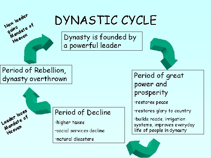 According to Chinese political theory, every dynasty goes through the so-called dynastic cycle: 1. A new ruler unites China and founds a new dynasty. 2. China, under the new dynasty, achieves prosperity and a new golden age. 3. The royal family of the dynasty begins to decay, corruption becomes rampant in the imperial court, and the empire begins to enter decline and instability. 4. The dynasty loses the Mandate of Heaven, their legitimacy to rule, and is overthrown by a rebellion. The Mandate of Heaven is then passed to the next dynasty