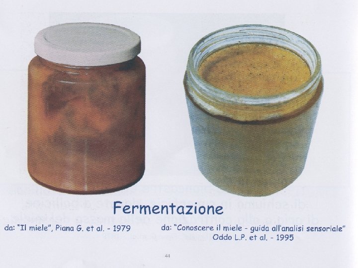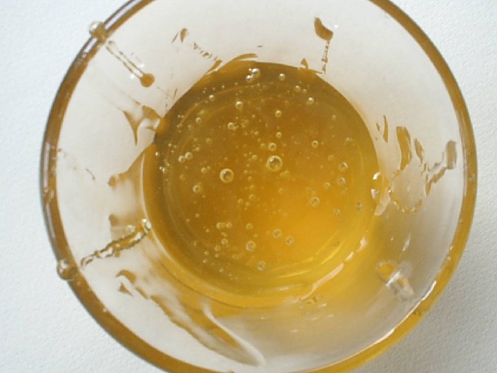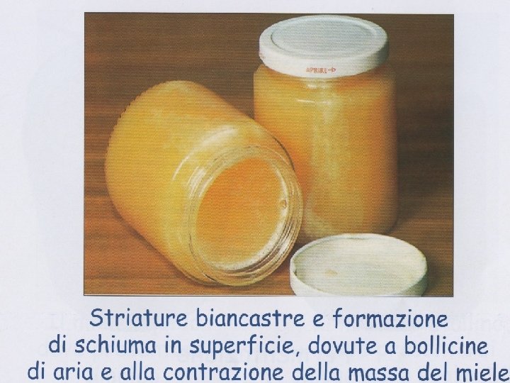 CARATTERI FISICI DI UN MIELE FERMENTATO • PRESENZA • • DI SCHIUMA ASPETTO SPUGNOSO PRESENZA DI BOLLE DI GAS