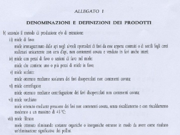 L. 12/10/1982 n° 753 Art. 1 Ai sensi della presente legge per miele si intende il prodotto alimentare che le api domestiche producono dal nettare dei fiori o dalle secrezioni provenienti da parti vive di piante o che si trovano sulle stesse, che esse bottinano, trasformano, combinano con sostanze specifiche proprie, immagazzinano e lasciano maturare nei favi dell’alveare.