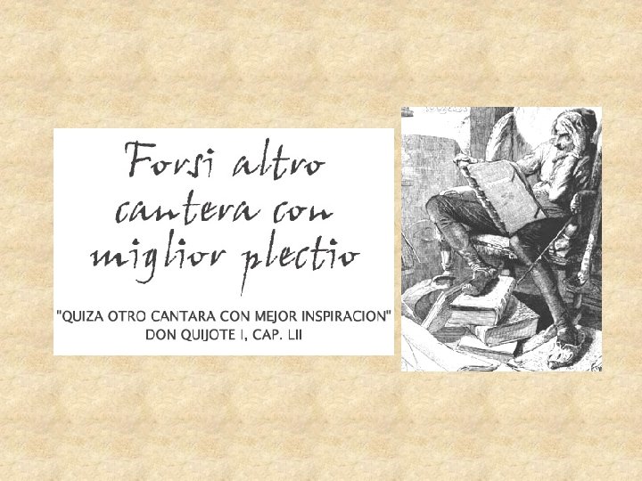 ARGUMENTO Alonso Quijano (Don Quijote) se vuelve loco por leer muchos libros de caballerías. Esta locura hace que intente imitar las aventuras que ha leído: sale de su pueblo, vive una serie de aventuras y regresa a casa vencido.