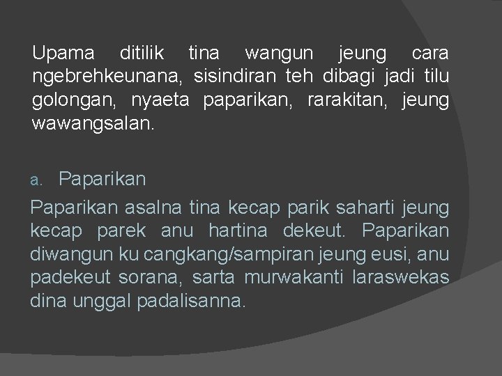 Mikaweruh Gaya Basa Ngupamakeun (simile) Tengetan conto sisindiran di handap Dina jero tas aya simbut Simbut kayas ti cimangkok Di kelas mani raribut Ribut kawas jogjog mondok Conto Sisisndiran di luhur ngagunakeun kalimat nu mangrupa babandinga. Kelas anu ribut disaruakeun jeung jogjog mondok. Ungkara basa saperti kitu disebut gaya basa ngupamakeun atawa simile. Saumpama dijentrekeun, gaya basa simile (majas perbandingan) nyaeta ungkara basa anu ngabandingkeun atawa ngupamakeun barang anu geus disebut samemehna jeung barang deui. Kecap-kecap anu sok digunakeunana di antarana : cara, kawas, saperti, ibarat, jeung kadya.