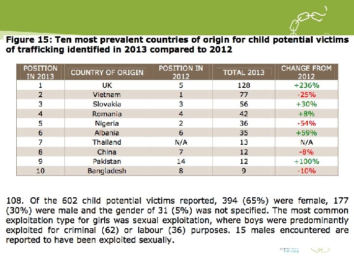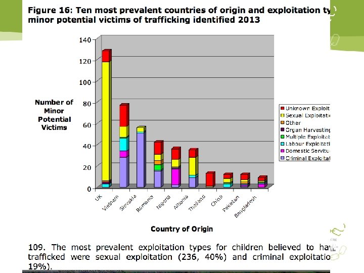 NCA Threat Assessment 2013 Of the 2, 744 potential victims of trafficking reported in 2013, 602 (22%) were children at the time of exploitation. This represents a 10% increase on the number of children encountered in 2012, but is a smaller proportion of the number of victims, as children represented 24% of the total number of potential victims in 2012. The most prevalent countries of origin of child potential victims of trafficking were UK (128, 21%), Vietnam (77, 13%), Slovakia (56, 9%) Romania (42, 7%), Nigeria (36, 6%), Albania (35, 6%), Thailand (13, 2%), China (12, 2%), Pakistan (12, 2%) and Bangladesh (9, 1%)