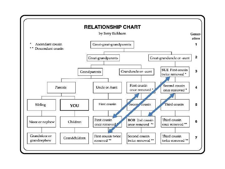 Relationships The easiest way to get a list of your second cousins (or any other relationship is to generate a Kinship Report. Set the Subject of the report to your ID# (or that of the person for whom you want the relationships). In the [Options. . . ] window=>General tab, select the Ancestors and Cousins options and set the number of generations to the desired number. You would use 2 for first cousins, 3 for second cousins, 4 for third, etc. The report gives all relationships within that number of generations. Be warned that if you have a large project and set the number of generations to the default (250), then the report may take some time to generate!! But you get an interesting report to look at.