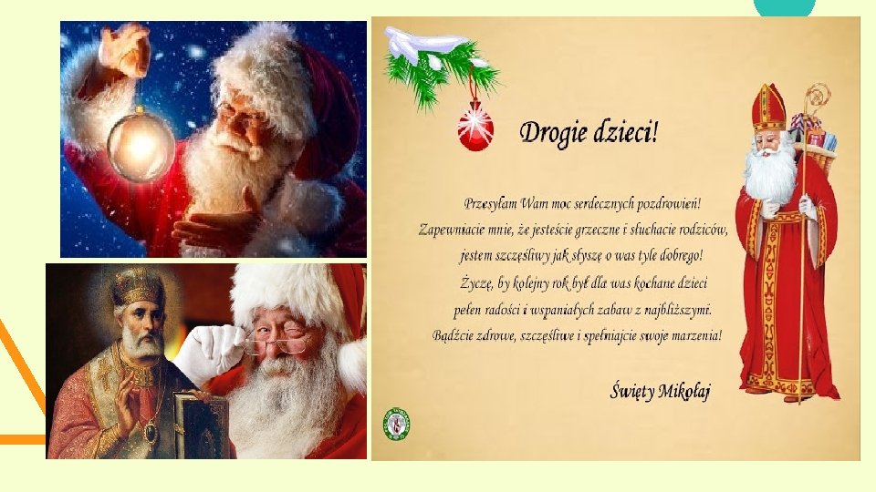Jak To Naprawdę Było z Tym Świętym Mikołajem? Święty Mikołaj, Biskup Miry, ze względu na przypisowane mu legendą uczynki (m. In. Cały majątek rozdał biednym), został pierwowzorem postaci rozdającej prezenty rozdającej dzieciom. Przedsatwieny jako starzec z okazałą brodą, często z infule pastorałem, z workiem prezentów i pękiem rózeg w ręce. 6 grudnia (w rocznice śmierci świętego Mikołaja) grzecznym dzieciom przynosi prezenty (zwykle słodycze), a niegrzecznym (na ostrzeżenie) rózgę. Jedna z legend głosi, że jeden człwiek, który podpadł w nędzę, postanowił sprzedać swoje 3 córki. Gdy Biskup dowiedział się o tym, nocą wrzócił przez komin trzy sakiewki z pieniędzmi, wpadły one do pończoch i do trzewików, które owe córki umieściły przy kominku dla wysuszenia. Stąd w krajach, gdzie w powszechnym użyci były kominki, powstał zwyczaj postawiania przy nim butów lub skarpet na prezenty. Tam, gdzie kominków nie używano, Mikołaj po cichu wsuwa prezent poduszke śpiącego dziecka. Początkowow świty Mikołaj przybywał z południa. Człowiek z ciepłych krajów zbytnio nie pasował zaśnieżonego zimowego pejzażu. To też gdy w roku 1822 Clemens Clarke Moore napisał poemat, w którym świty Mikołaj przybywa saniami zaprzężonymi w renifery z bieguna północnego, wkrótce przyjęło się to do tradycji.