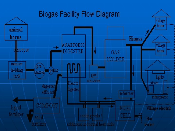 v v v Bio Gas Bahan baku : limbah organik, pupuk kandang, tanaman air (misal : eceng gondok) Proses : fermentasi anaerob Produknya berupa : gas / metan (CH 4) 50 -70% dg sifat mudah terbakar, tidak berwarna, tidak berbau CO 2 25 -45%, H 2, N 2, H 2 S