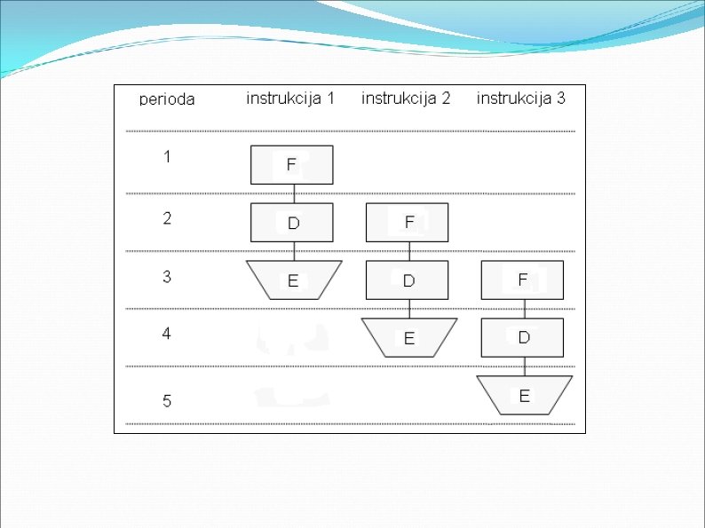 Protočna obrada - pipelining Protočna obrada znači da se instrukcije obrađuju u nezavisnim stepenima za čije izvršavanje je potreban jedan radni takt. Ovo omogućava paralelno izvršavanje instrukcija. Pipelining podrazumeva odvojenost stepena za čitanje (fetch), dekodiranje (decode) i izvršenje (execute) instrukcije. Ovo je slučaj kod trostepene protočne obrade, noviji procesori imaju i više od tri stepena. Kako su stepeni odvojeni moguće je nakon učitavanja jedne instrukcije odmah početi sa učitavanjem druge, jer je stepen za čitanje slobodan i nezaposlen. On sada učitava drugu instrukciju, a stepen za dekodiranje dekodira prvu. Ovo se ponavlja i izvršavanje se ubrzava onoliko puta koliko stepena imamo, u ovom slučaju tri.