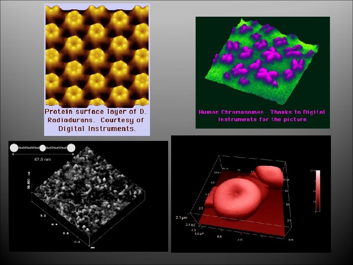 Mikroskop sił atomowych AFM- Atomic Force Microscopy Za pomocą mikroskopu sił atomowych dokonuje się pomiaru siły działającej między atomami próbki a ostrzem mikroskopu. Złota, delikatna folia jest zaopatrzona w diamentowe ostrze. Wychylenia folii w miarę skanowania są rejestrowane przez umieszczony za nią drugi mikroskop tunelowy. Można mierzyć już wychylenia 10 -2Å. Możliwe są pomiary siły w granicach 10 -6 - 10 -13 N. Energia wiązania jonowego 10 e. V, czemu przy odległości 0, 16Å odpowiada siła 10 -7 N. Energia wiązania typu van der Waalsa 10 me. V, czemu przy odległości 0, 16Å odpowiada siła 10 -11 N.