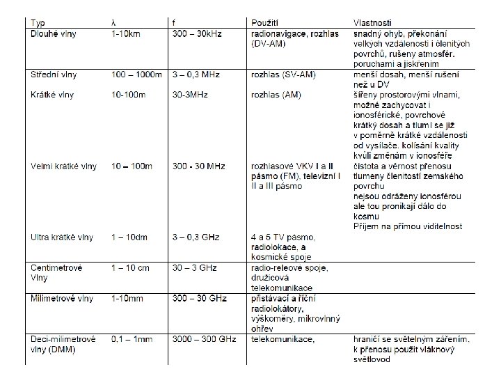 Použití • Průmyslová aplikace – využití pro ohřev nebo vysoušení materiálů – materiál, který je vysoušen, je ztrátové dielektrikum, takže se mikrovlnná energie absorbuje a mění na teplo – výhody – větší rychlost ohřevu, bezpečnost, ekologie, vyšší kvalita • Spoje – pozemní služby – radioreléové spoje - směrový radiový spoj realizovaný postupně od stanice ke stanici, používaný pro přenos signálů – geostacionární satelity – 1 GHz – mobilní telefony – 800 -1900 MHz – bluetooth, wi-fi – 2, 45 MHz